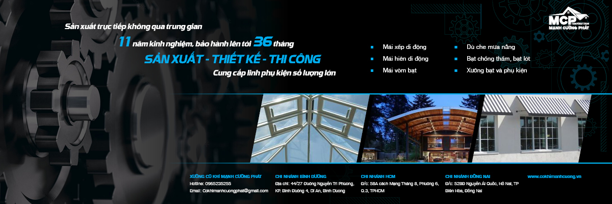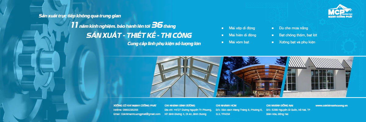 Xưởng cơ khí Mạnh Cường Phát 11 năm kinh nghiệm sản xuất, thiết kế, thi công, lắp đặt các loại mái xếp di động, mái mái hiên di động, mái vòm, dù che mưa nắng, bạt chống thấm, bạt lót ao hồ, bạt phủ xe tải, bạt che công trình.. theo yêu cầu khách hàng tại các tỉnh thành phía Nam.